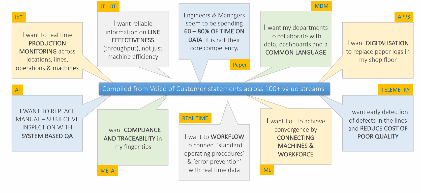 Manufacturing companies have been and, continue to make significant investments in Digital Technologies yet, derive very little returns from data. Every action on the shop floor creates data, creating an ever-growing need, to derive actionable insights and, to deliver tangible outcomes.